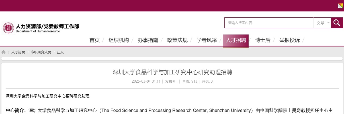 【2025广东深圳大学食品科学与加工研究中心研究助理招聘公告进入阅读模式】相关岗位: