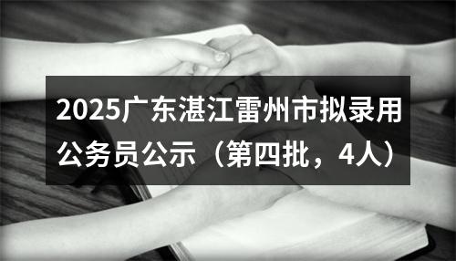 根据《中华人民共和国公务员法》《广东省2025年考试录用公务员公告》和有关规定,4名同志参加2025年广东省统一组织的公务员录用考试,经过笔试、资格复审、面试、体检和政审考察,拟录用为雷州市公务员。现就有关情况予以公示,征求社会各界意见。如对拟录用人选有异议或其他问题,请于公示期间向我部反映。